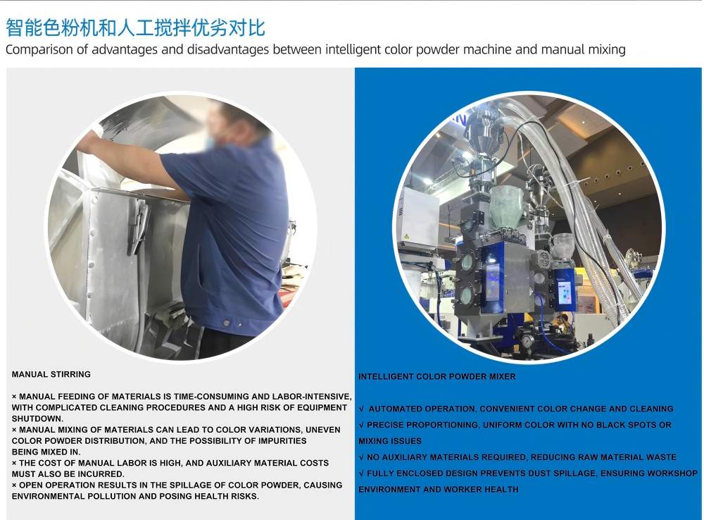 100kg/h"Älykäs värijauhesekoitus" voidaan integroida saumattomasti keskitettyihin syöttöjärjestelmiin, keskitettyihin kuljetusjärjestelmiin ja automaattisiin materiaalinkäsittelyjärjestelmiin. Plastic Color Mixer on varustettu erittäin tarkoilla punnitusantureilla, jotka varmistavat sekoitusprosessin tasaisuuden ja värin tasaisuuden sekä tukevat monikomponenttijauheiden ja lisäaineiden automaattista annostelua.
